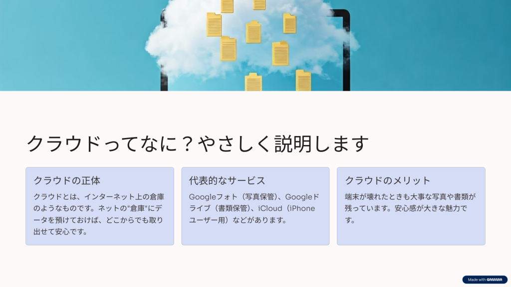 実はクラウドとは、インターネット上の倉庫のようなもの。スマホやパソコンに保存する代わりに、ネットの“倉庫”にデータを預けておけば、どこからでも取り出せて安心、という仕組みです。