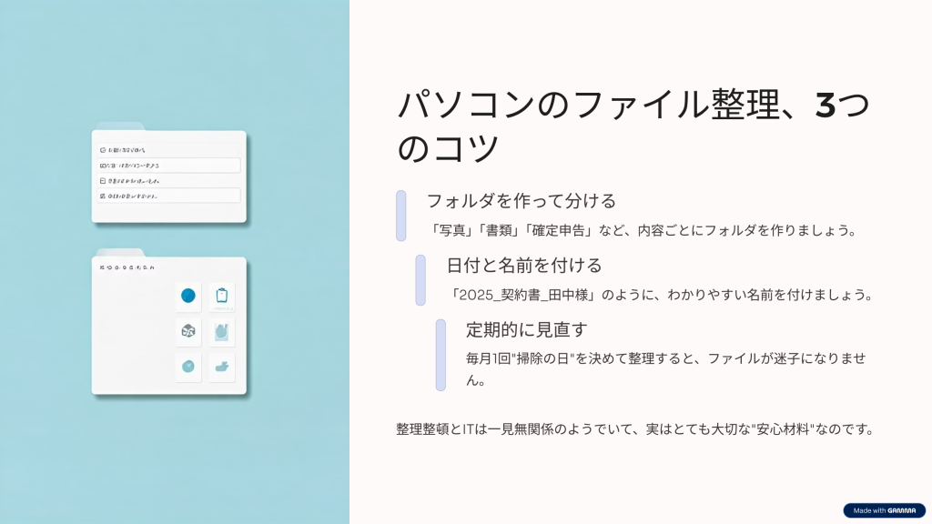 「どこに保存したかわからない」「デスクトップがごちゃごちゃ」という声もよく聞きます。整理のコツはとてもシンプルです。