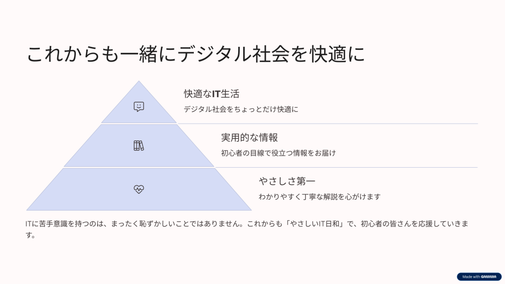 やさしいIT日和では、これからも初心者の目線で、やさしく・わかりやすく・実用的な情報をお届けしていきます。「少しだけITがわかるようになった」と感じていただけたら、それが何より嬉しいです。