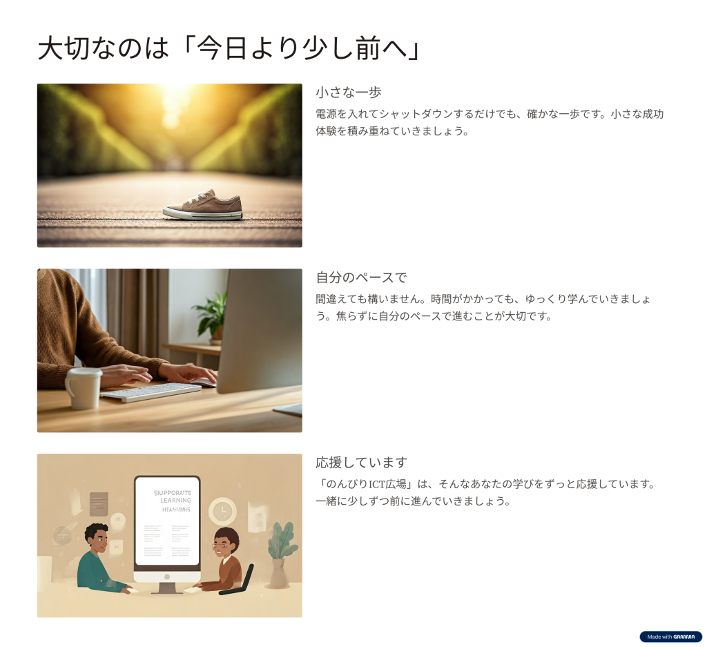 この「のんびりICT広場」では、IT初心者の方に寄り添いながら、やさしく一歩ずつ進める方法をご紹介します。