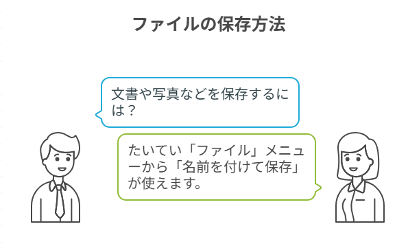 文書や写真などを保存するには、たいてい「ファイル」メニューから「名前を付けて保存」が使えます。