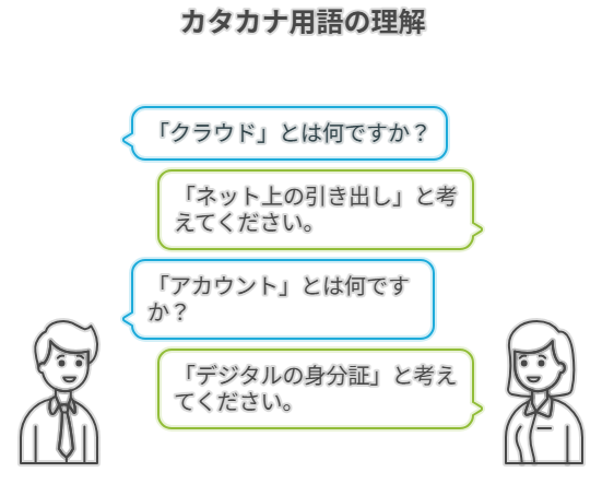 たとえば「クラウド」は「ネット上の引き出し」、「アカウント」は「デジタルの身分証」と置き換えてみると理解しやすくなります。
