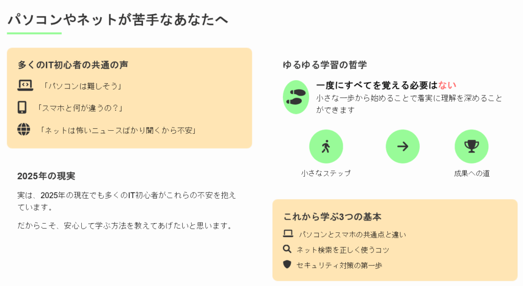 実際に、2025年の今でもパソコンに苦手意識を持つ方は多くいます。でもご安心ください。ITの世界は、一度にすべてを覚える必要はなく、小さなステップを積み重ねるだけで十分なんです。