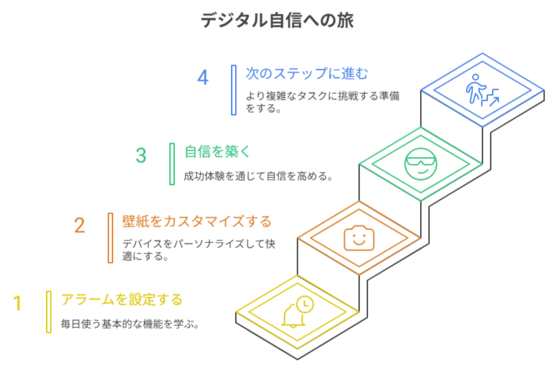 いきなり難しいアプリを使おうとすると挫折しやすいものです。まずは「アラームをセットする」「お気に入りの写真を壁紙にする」など、日常に直結する操作から始めましょう。