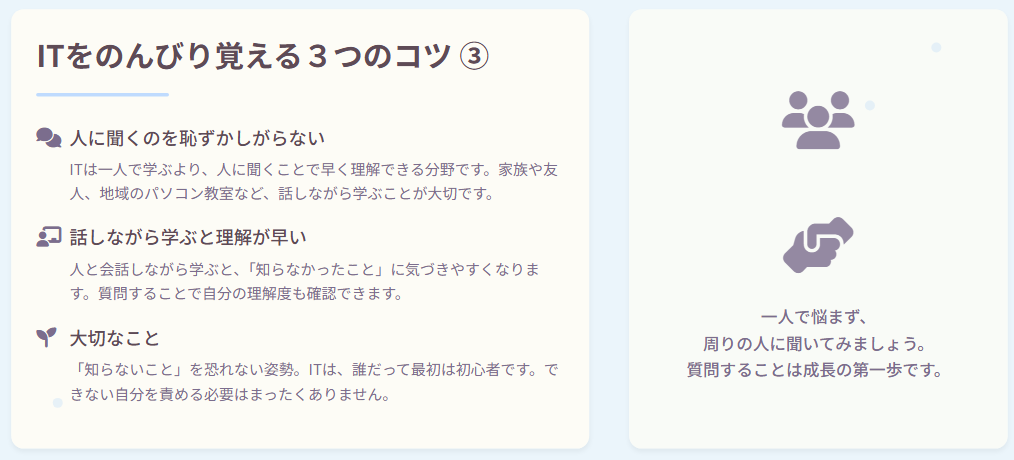 この記事では、ITが苦手な方が「のんびり覚える」ための3つのコツをお伝えします。