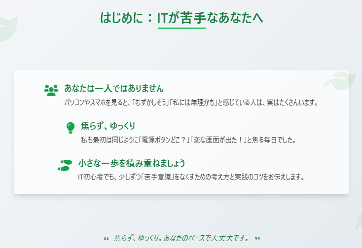 あなたのペースで進んでいけば、いつの間にか「ITが得意な人」になっています。