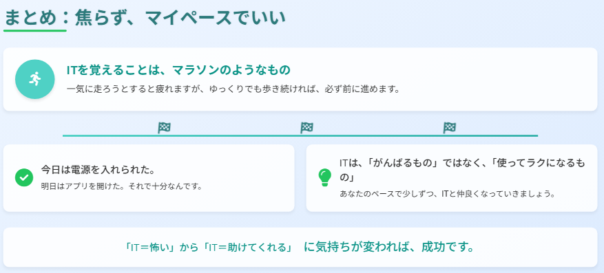 あなたのペースで少しずつ、ITと仲良くなっていきましょう。