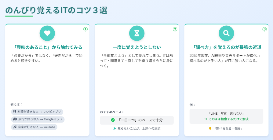 ここでは、焦らず・ゆるく・でも確実にITを身につけるための3つのコツをご紹介します。