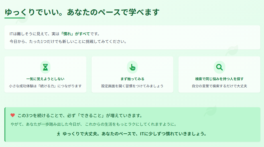 あなたのペースで、ITに少しずつ慣れていきましょう。