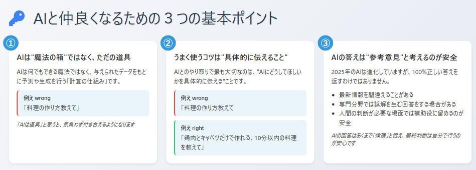 この3つを覚えておくだけで、AIとの距離はぐっと縮まります。