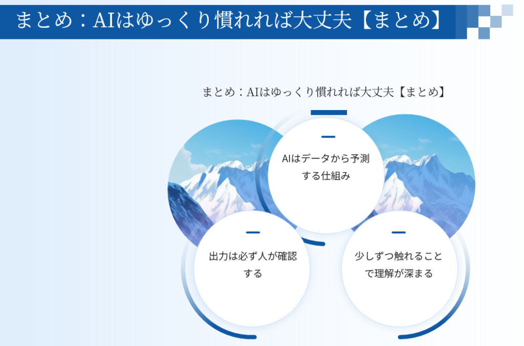 - まとめ:AIはゆっくり慣れれば大丈夫【まとめ】