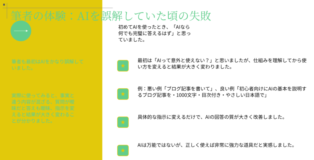 - 筆者の体験:AIを誤解していた頃の失敗