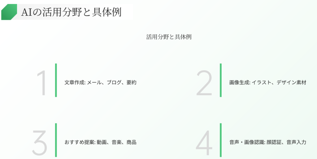 AIの活用は非常に幅広いですが、初心者が理解しやすい代表的なケースを4つ紹介します。