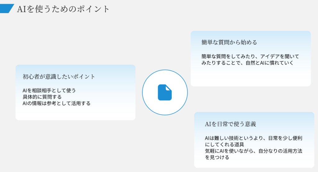 AIをうまく活用するためには、いくつかの基本的なポイントがあります。