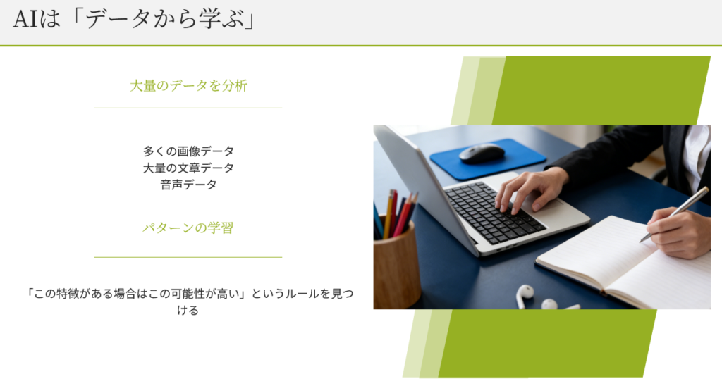 AIは人間のように経験から学ぶわけではなく、大量のデータを分析することでパターンを学びます