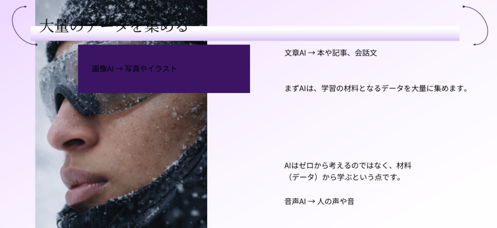 ポイントは、AIはゼロから考えるのではなく、材料(データ)から学ぶという点です。