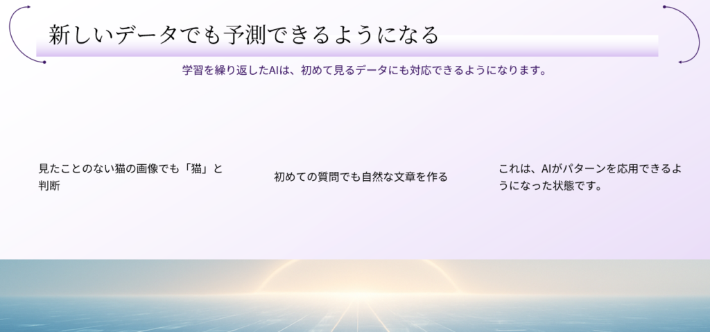 学習を繰り返したAIは、初めて見るデータにも対応できるようになります。