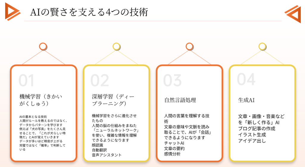 AIは魔法ではなく、いくつかの技術の組み合わせで成り立っています。ここでは、初心者でも理解しやすい4つのポイントに絞って解説します。