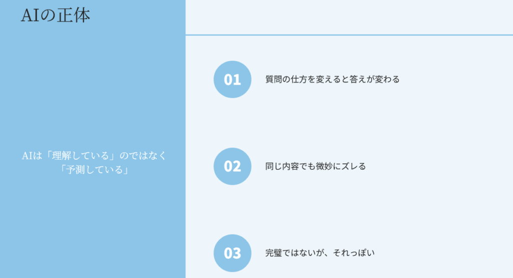 👉 AIは「理解している」のではなく「予測している」