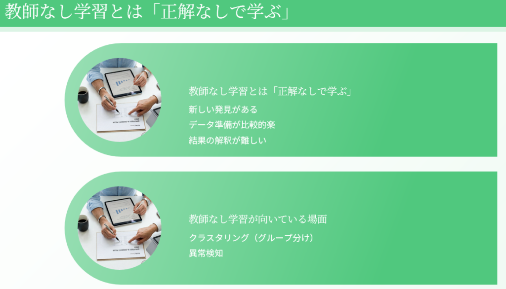 教師なし学習は、「正解」を与えずにデータの特徴を見つける方法です。