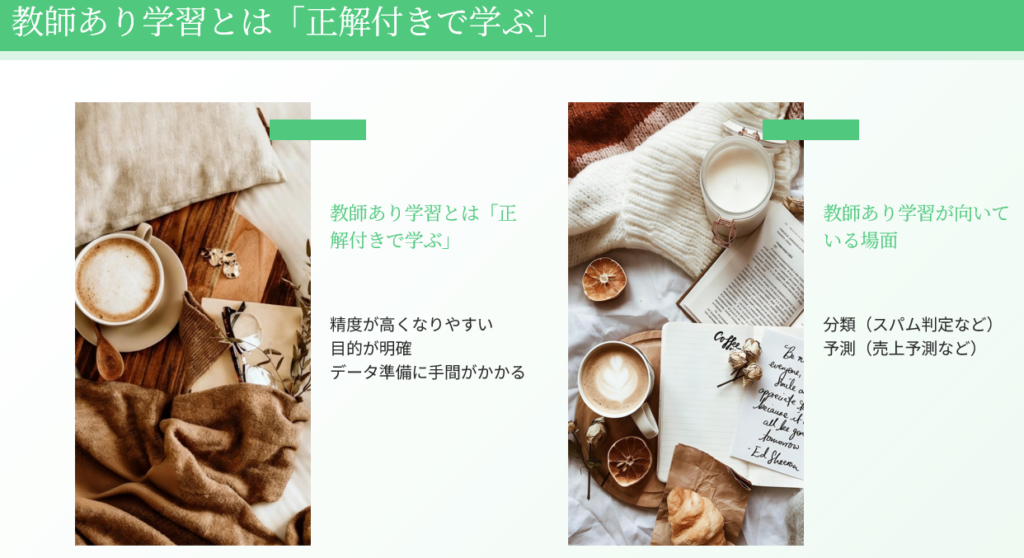 教師あり学習は、あらかじめ「正解」が用意されている学習方法です。