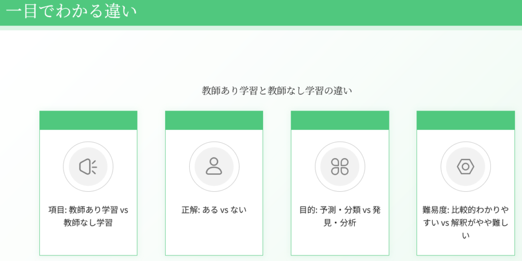 | 項目 | 教師あり学習 | 教師なし学習 |